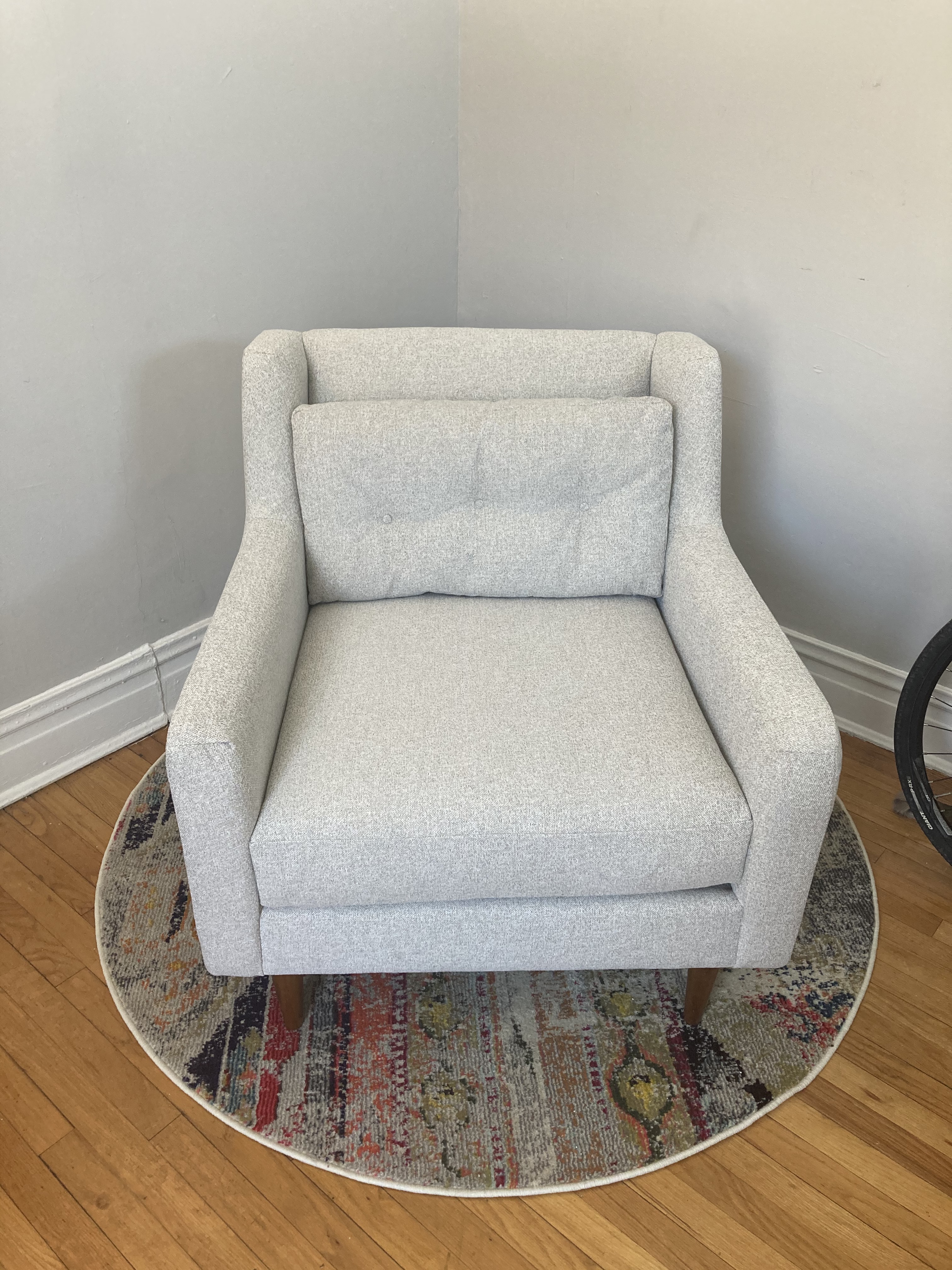 For all of the hype I’ve put on this chair, the delivery was anti-climactic, taking about 15 minutes total. My roommate and I masked up and the delivery guys masterfully placed the chair onto the rug I had purchased quickly after my order in November. As they sat the piece into it’s designated place in our apartment, it felt like finishing a chapter of a long awaited book.