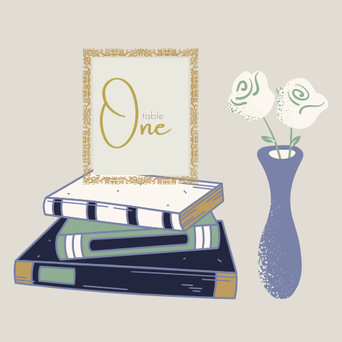 Our centerpieces are going to have a vintage-y vibe that compliments our wedding venue. I don’t want centerpieces that tower in the middle of the table because I feel they prevent people from having decent conversations. We’ll be using a stack of two to three books on each table, with a golden frame featuring the table numbers, and a very small vase with minimalist bouquets on the side. Below is a small draft of what I have in mind.