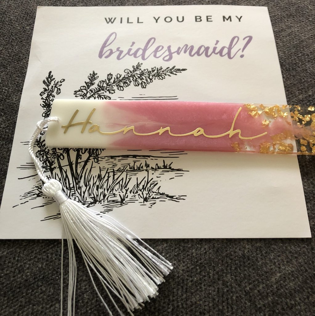 When asking my bridesmaids to be in my wedding, I sent each of them a handwritten card in the mail with a personalized resin bookmark I found on Maris Splendid Designs‘s Etsy page. I closed off each letter with a cheeky, “You’re officially booked for our wedding!” I created the notecard myself on Canva, with the design featuring one of the flowers that will be used in our wedding. A picture of it is below and here’s a link to the finished card if you’re interested in using it!