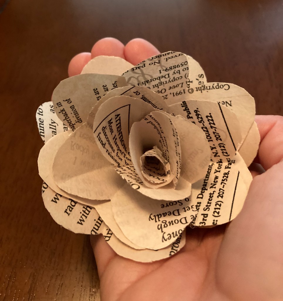 I’m working on making book roses for my bouquet, the bouquet of my bridesmaids, and my fiance’s one groomsmaid. They’ll be mixed in with Irish wildflowers, greenery, and some white roses in my bouquet, and a selected wildflower, baby’s breath, and greenery for my bridesmaids. I’m working with this DIY guide found on instructibles.com. I’ve only managed to make the pedals of one flower so far but am feeling rather confident in the way they’ll turn out!