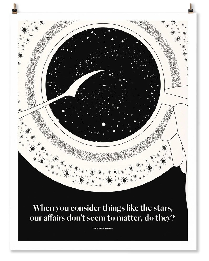 Out of the shops known for lit art on Etsy, the black and white (sometimes red) designs of ObviousState stand out the most. They are sleek, elegant, and somewhat cheeky while paying homage to some of the greatest writers known throughout history. The digital storefront, run by Evan and Nichole Robertson, currently has over 100 prints to choose from. Authors include philosophers like Aristotle, playwrights like Shakespeare, and poets like Rumi. Each print is $22.40 a piece (currently 20% off), or you can purchase three 11×14 prints for $40.* Not finding a quote you like? The shop also offers custom prints!